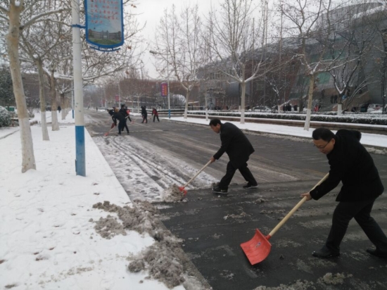 第二天上午8:00时,扫雪活动正式开始,扫雪区域是知行中路路段,南起实验楼南小路西端,北至搏翔路西端。大家拿上铁锹和扫帚,在公司领导的带领下除冰扫雪,清理路面。在大家的通力合作下,路面的积雪很快被清扫干净,为广大师生开辟了一条温情的安全之路。在整个义务劳动过程中,同学们不畏严寒,发扬吃苦耐劳、乐于奉献的志愿精神,尽管很多同学手冻得通红,但大家都很开心。