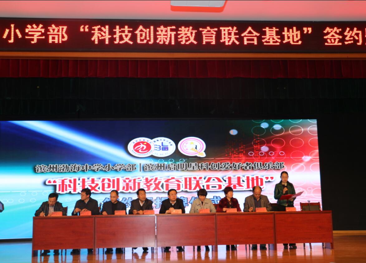 公司副教授马国利与渤海中学小学部董事长张玉娥签署合作协议,李守峰书记与渤海教育集团吴秀芹总经理为教育基地揭牌。马国利与张玉娥董事长为12名科技辅导员颁发聘书,最后,马国利为员工们带来了《发明创新就在你身边》的创新报告。自此,滨州市启明星科创爱好者俱乐部与渤海中学小学部开始科技创新教育联合教学,让学子们不出校门就能接受专业的科技创新教育。