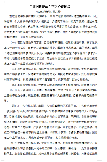 会前,每位党员老师按要求撰写了上阶段的学习心得体会。会上,每位党员老师聚焦公司两大攻坚战,对照党章党规、对照党员“四讲四有”标准和“四个合格”要求、对照上年度组织生活会检视问题整改情况,结合自己的本职工作,开展问岗位职责是什么、问实绩实效如何、问差距短板在哪里、问怎么改怎么干“四问担使命”学习讨论,深刻检视并进行了反思。每位党员发言后,大家进行了热烈的讨论。大家纷纷表示要讲政治、有信念,讲规矩、有纪律,讲道德、有品行,讲奉献、有作为,做“四讲四有”的合格党员。
