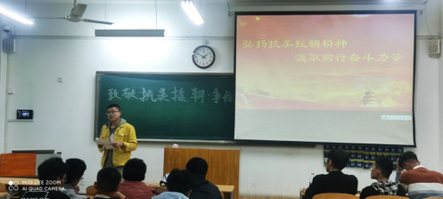 活动中,同学们集中学习了习近平总书记在纪念中国人民志愿军抗美援朝出国作战70周年的讲话,通过讲解、观看视频,重温抗美援朝历史,追忆激情岁月,祭奠缅怀先烈,学习和弘扬伟大爱国主义精神和英勇顽强、舍生忘死的革命英雄主义精神。