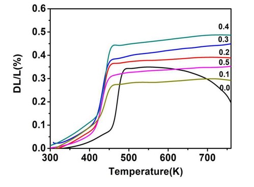 ZrxAl2-xMo3-xVxO12 (x=0.0, 0.1, 0.2, 0.3, 0.4,0.5)的膨胀系数曲线可以看出随着离子掺杂浓度的增大材料在宽温区内均表现出优异的低膨胀特性(图1),热膨胀曲线是平滑的线性,没有发生突变现象,说明通过离子掺杂改善了材料的吸水性。