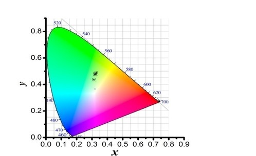 ZrxAl2-xMo3-xVxO12具有非常强的宽谱带发光特性,有一个较宽的绿光发射带(图2),发光范围覆盖了从370 nm 650 nm的可见光区域,在不同掺杂量下的色坐标可以看出材料发出的是淡绿色的光,随着离子掺杂量的增加色坐标变化不大,PL谱发光强度变得越来越强。