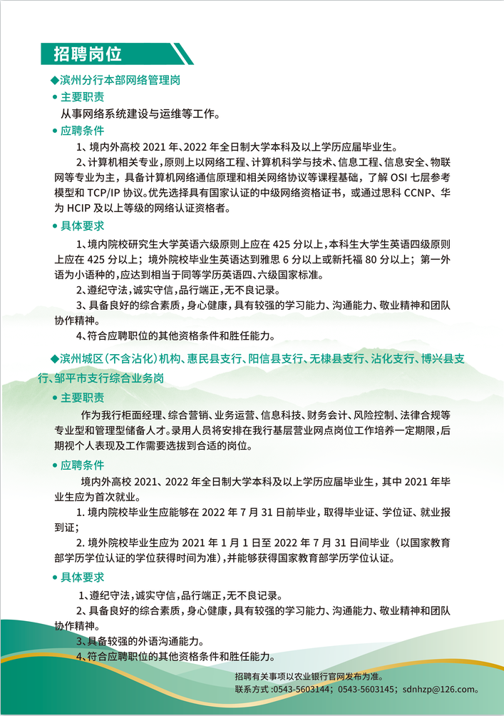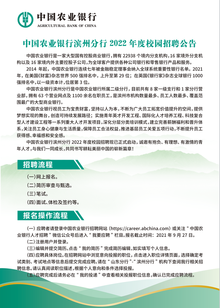 正在阅读:中国农业银行滨州分行2022年度校园招聘公告