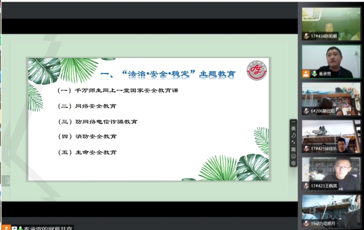 为进一步在员工中开展法治安全教育,确保安全意识入心入脑。哈哈体育于4月17日晚分年级开展“法治•安全•稳定”线上主题教育活动,年级辅导员主持活动。