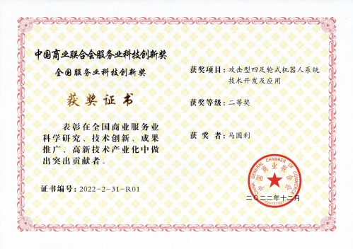 近日,中国商业联合会主办的2023年全国商业科技质量大会在北京召开。公司马国利教授领衔完成的研究成果“攻击型四足轮式机器人系统技术开发及应用”荣获中国商业联合会服务业科技创新奖二等奖。