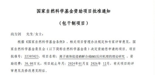 近日,2023年度国家自然科学基金项目评审结果公布,公司尚方剑博士获得国家自然科学基金青年项目资助,项目名称为《离子液体促进硝解合成HMX反应机理的理论研究》。