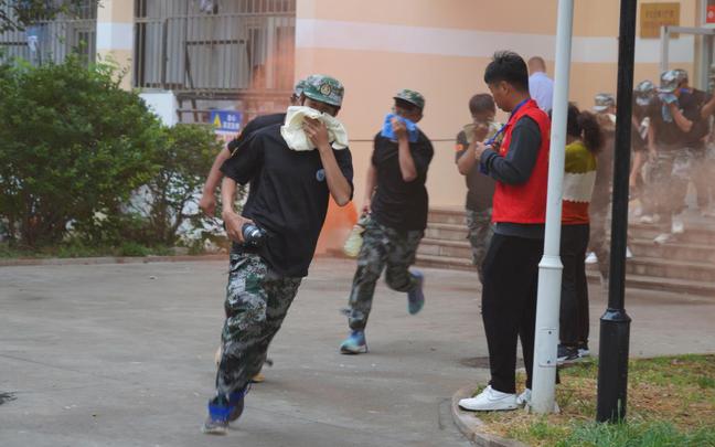 演练模拟了11号员工公寓突发火灾,公寓管理中心工作人员现场报警,师生们用湿毛巾捂住口鼻沿疏散通道展开紧急疏散逃生。与此同时,校园灭火组、疏散指挥组、治安保卫组、救护组、后勤保障组等工作人员按照应急处置预案迅速赶到现场开展工作。消防队员到达现场后,迅速解救被困人员,并进行消防灭火。