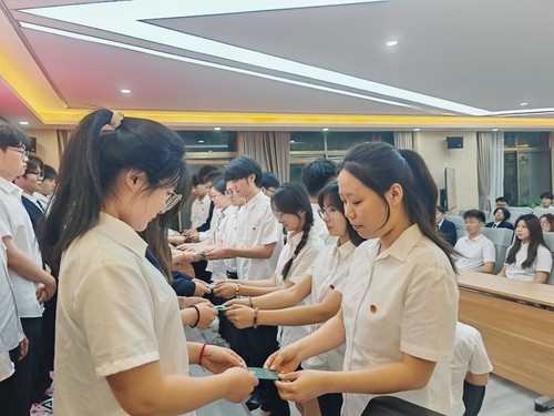 仪式在庄严的国歌声中拉开帷幕。经过为期一个月的入团积极分子培训及严格考核,57名优秀青年被批准加入中国共产主义青年团。各团支部书记为新团员佩戴团徽并颁发团员证。在领誓人晨雨的带领下,全体新老团员高举右拳,面向团旗庄严宣誓,铿锵誓言彰显出新时代青年为共产主义事业奋斗的坚定信念。熠熠生辉的团徽佩戴在胸前,崭新的团员证紧握手中,这不仅是一份荣誉,更是一份责任与担当。入团宣誓后,田家庆作为新团员代表发言,表达了对团组织的感激之情以及未来在学习和生活中发挥模范带头作用的决心表示将以实际行动践行入团誓词,积极参与团组织活动,为集体和公司发展贡献自己的力量优秀团员代表庞祥艺则分享了自己入团以来的成长经历与感悟,激励新团员要珍惜这份荣誉,坚定理想信念,主动挺膺担当不断追求进步